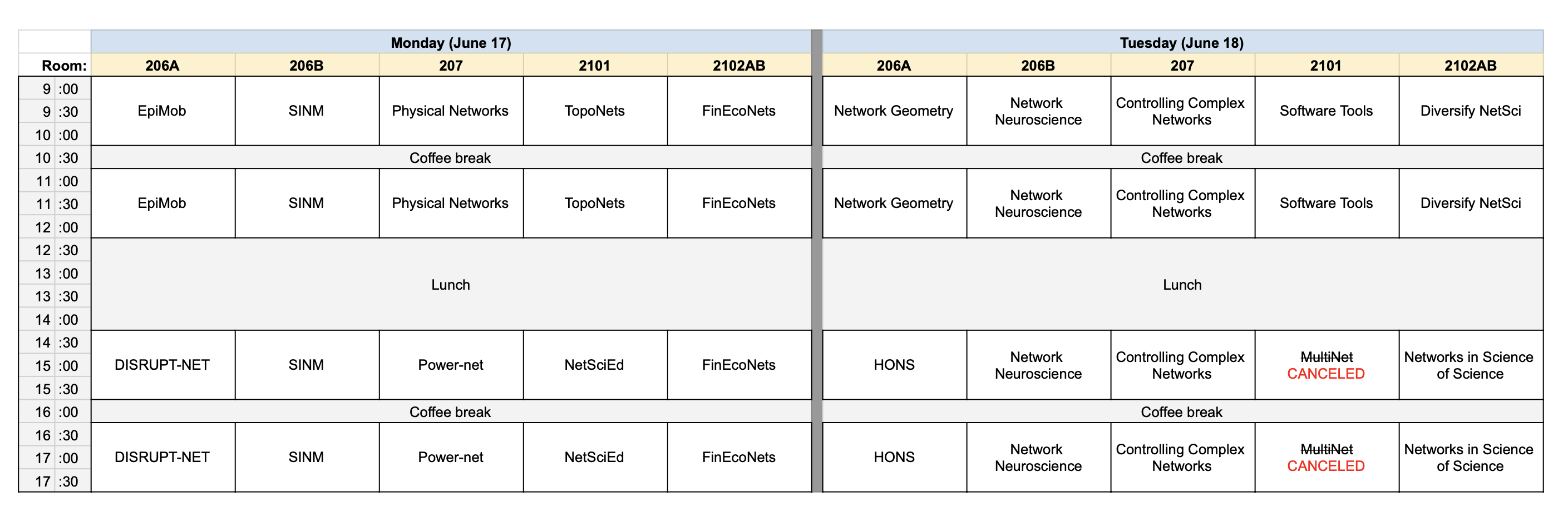 This is an overview of the core schedule for the satellites. Please review the NetSci2024 interactive program or the satellites' website below for an up-to-date, detailed schedule.